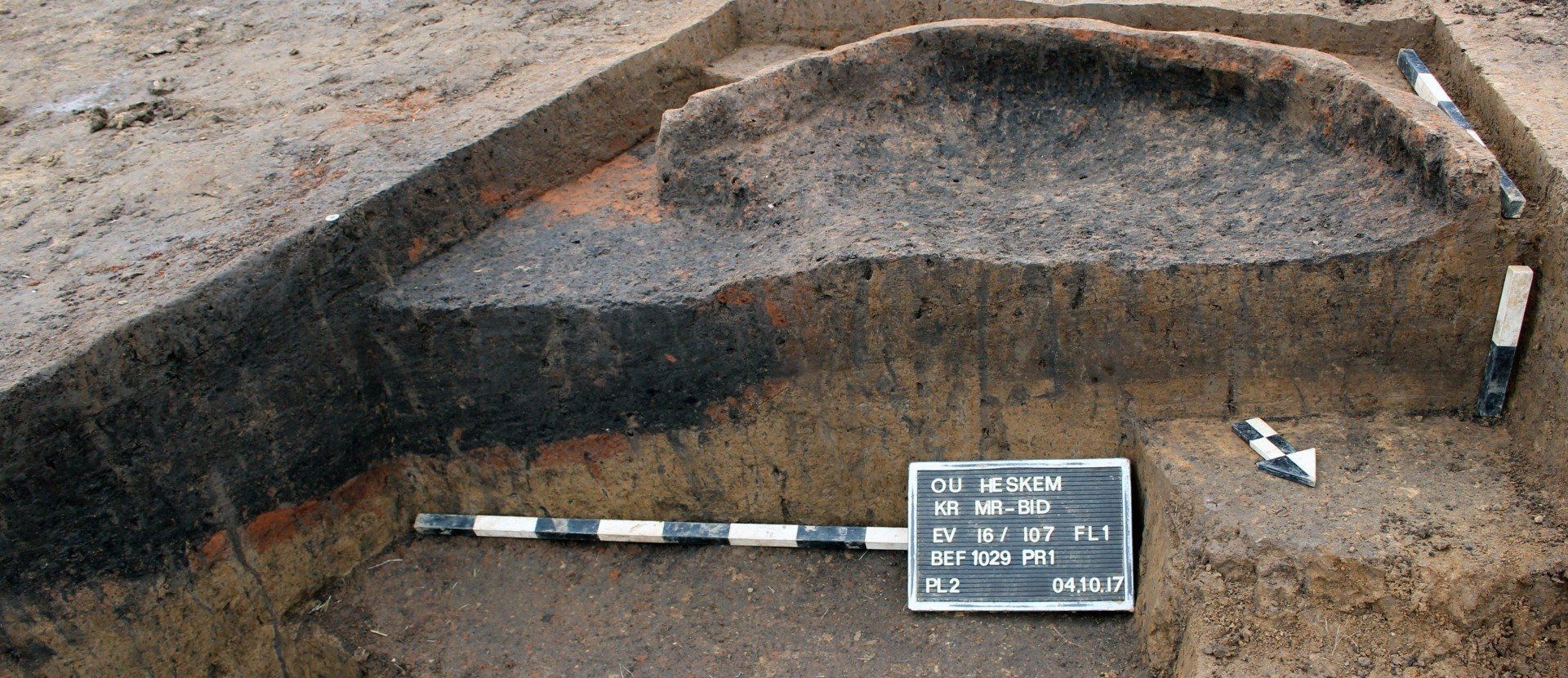 Beim Oberbodenabtrag im Bereich einer im Bau befindlichen Ortsumgehungsstraße bei Ebsdorfergrund-Heskem, Kr. Marburg-Biedenkopf, wurde eine Vielzahl von schwarzen Bodenverfärbungen aufgedeckt. Diese erwiesen sich als Gruben und Hausgrundrisse einer linearbandkeramischen Siedlung. Während der folgenden Ausgrabung wurden 25 Hausgrundrisse freigelegt, die offensichtlich mehreren Entwicklungsphasen jener ersten jungsteinzeitlichen Bauernkultur zuzuweisen sind (ca. 5500 – 4900 v. Chr.). Von besonderer Bedeutung ist einerseits die Existenz von ältestbandkeramischen Häusern und Funden, andererseits aber auch von Keramik, die in die jüngste Entwicklungsphase der linearbandkeramischen Kultur zu stellen ist. Zudem wurden zwei Bestattungen innerhalb der Siedlung dokumentiert, darunter das Skelett eines vermutlich 6-7 jährigen Mädchens in einer Grube zwischen zwei Häusern. Spannend waren auch fünf um eine Eintiefung angeordnete Grubenöfen, die offenbar zum Backen, Rösten oder Darren genutzt wurden.